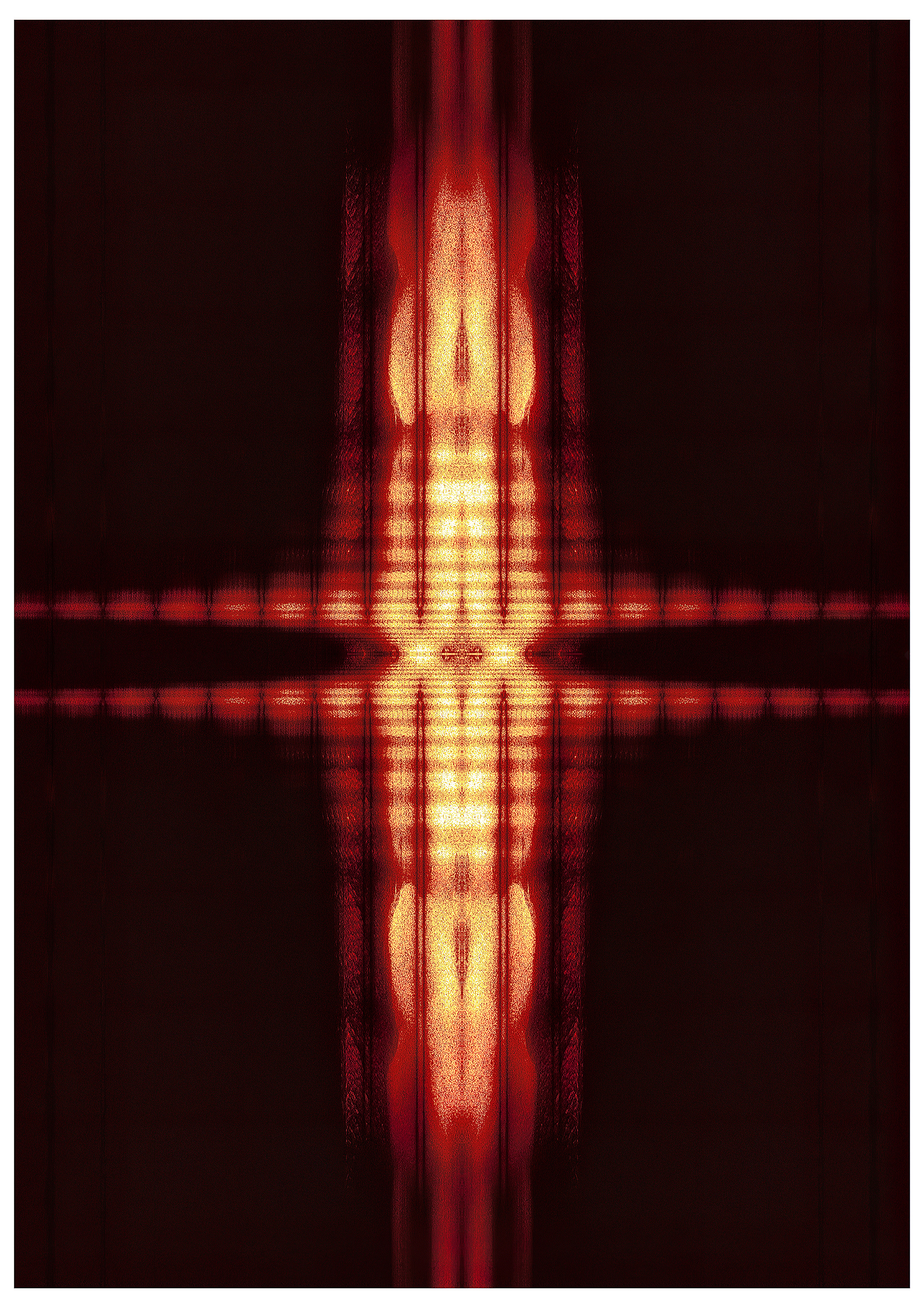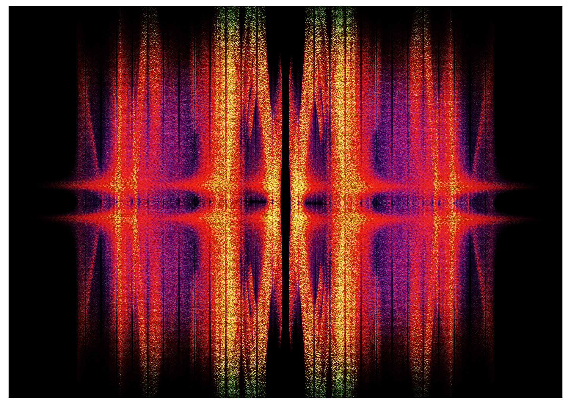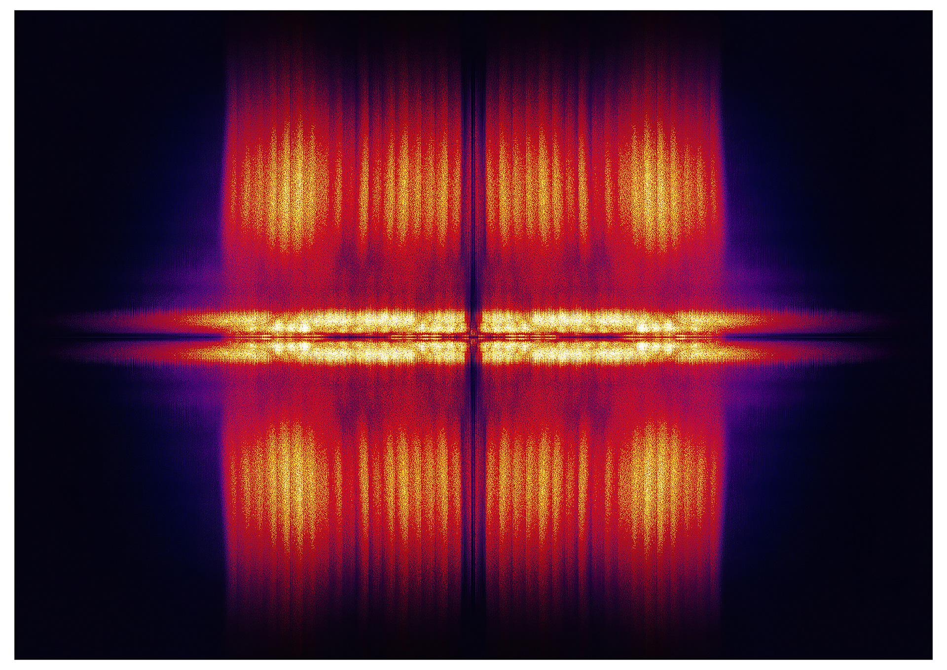 Interfearence interrogates the conditions of portraiture through processes of translation, distortion, and systemic failure. Photographic portraits are extracted from their traditional function as mimetic records and reconfigured as raw data. This data is imported into a digital audio environment, where it is subjected to operations of modulation, compression, reverberation, and distortion. The image is treated as signal, its visual information recast as sound, its surface reconstituted as a field of frequencies and temporal events. The resulting audio is then visualised as spectrograms, returning to the register of the image, but only through the residue of its own transformation.