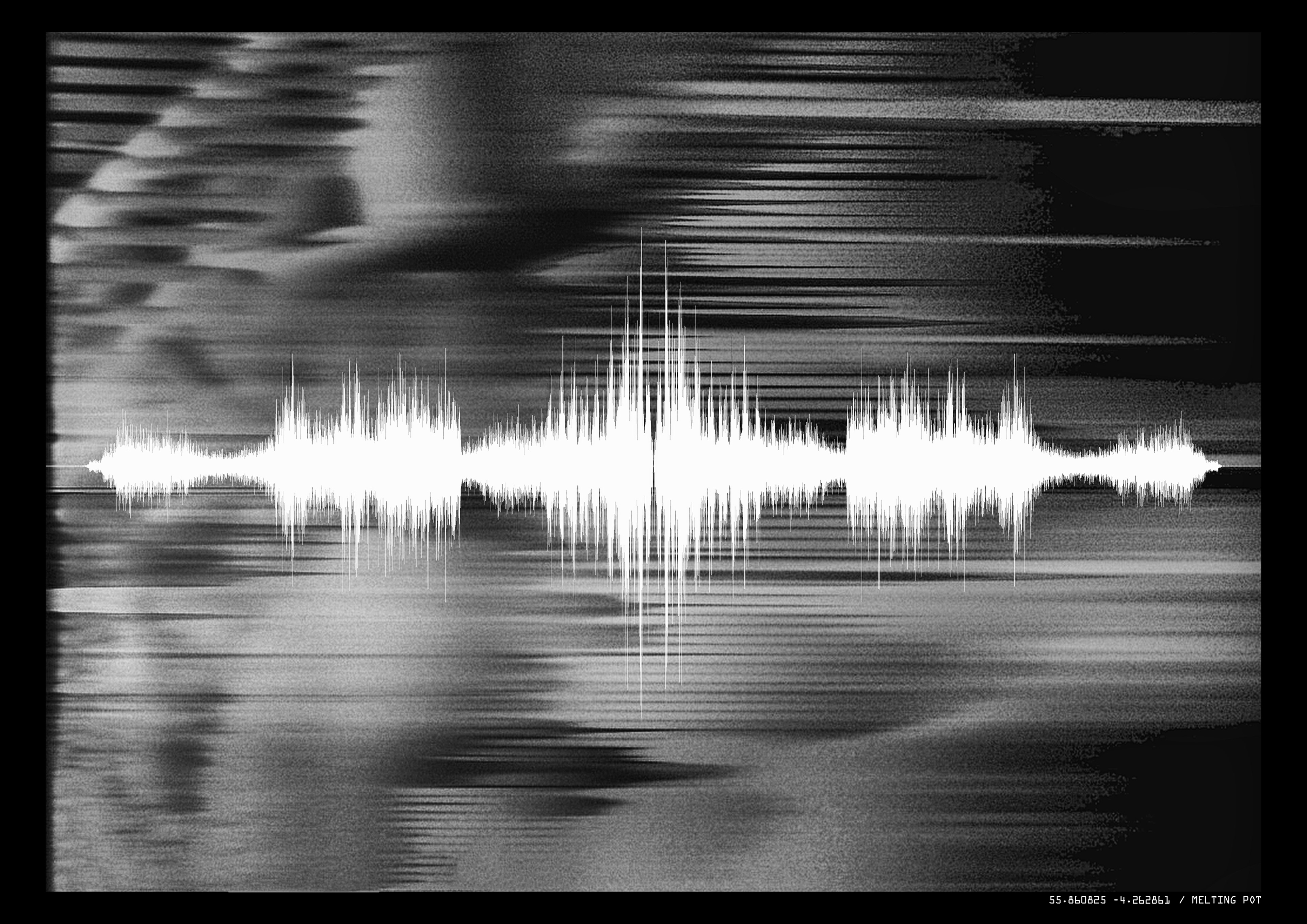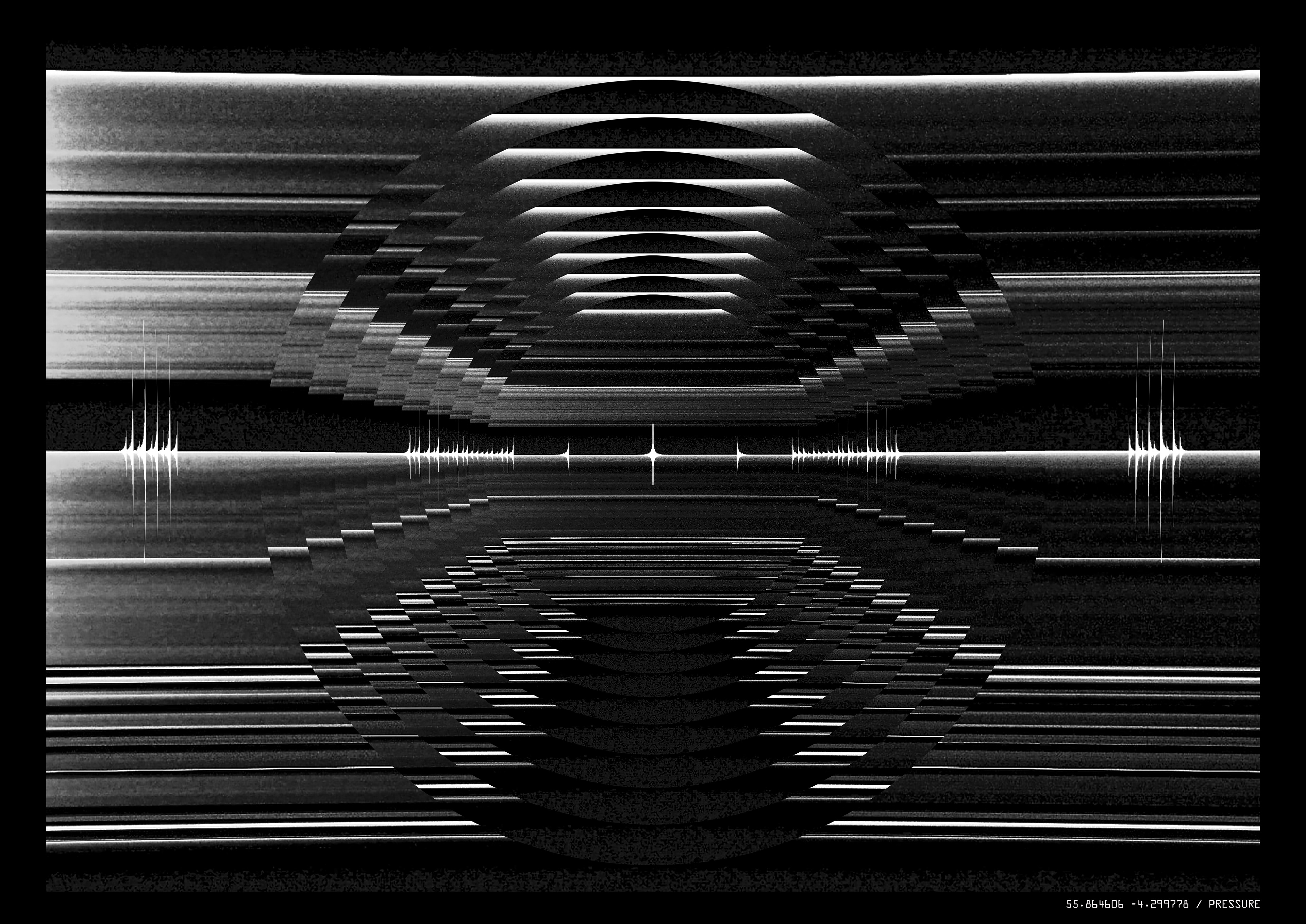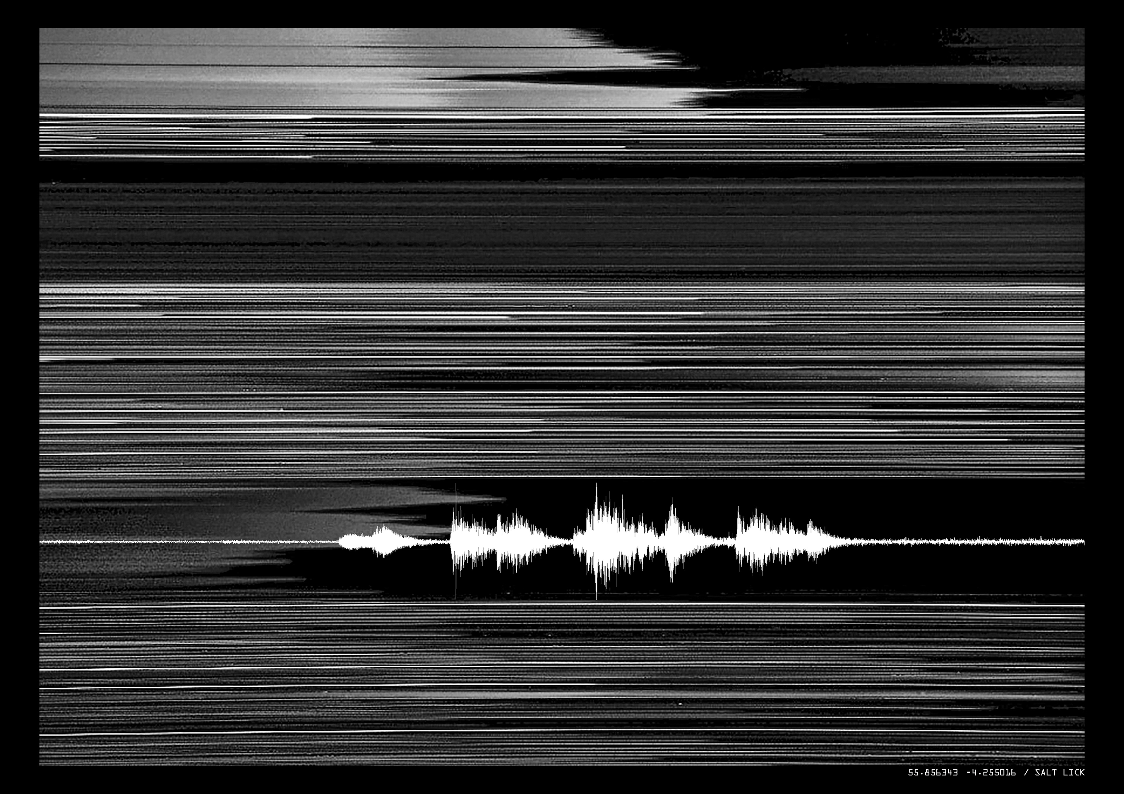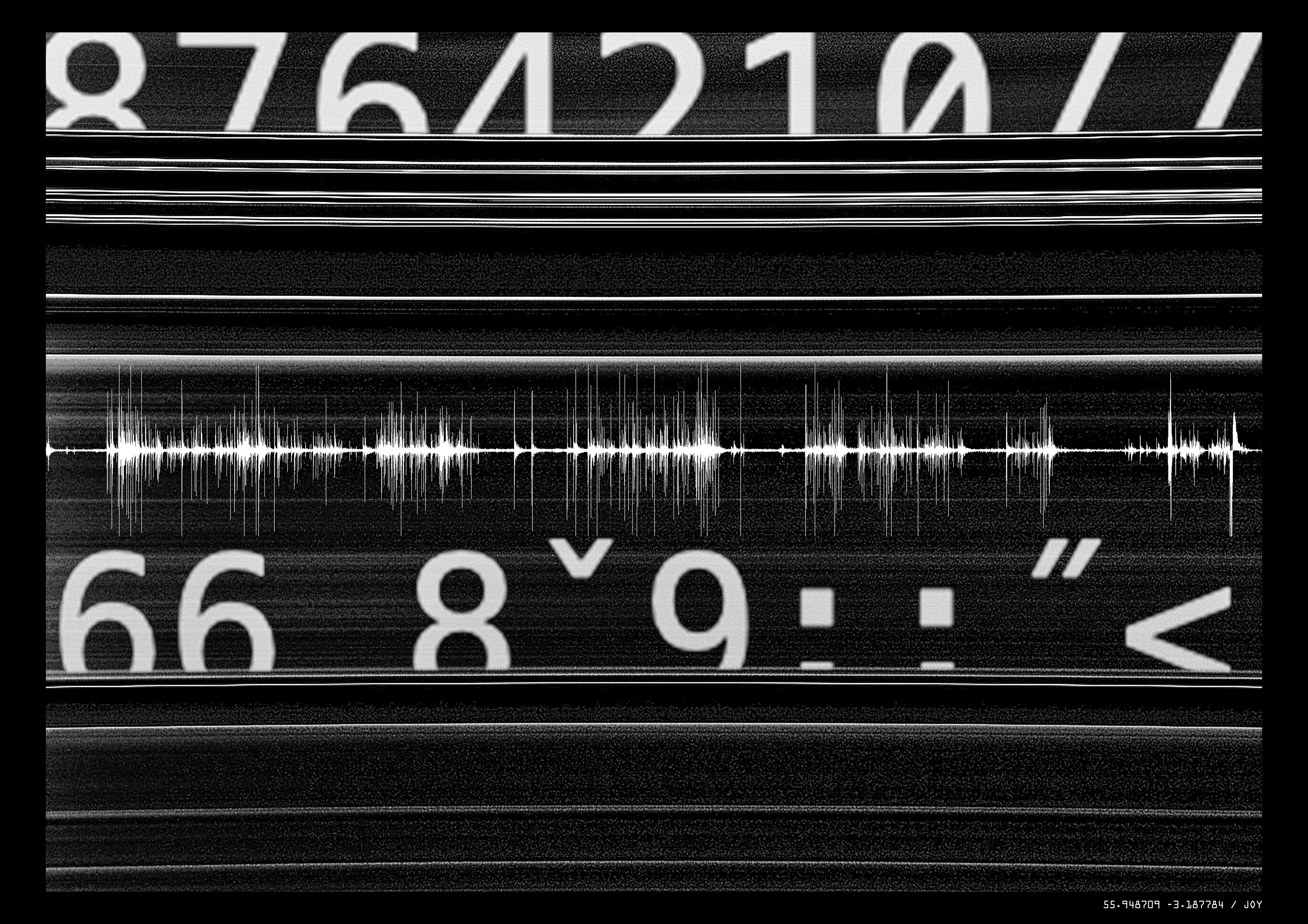 Alongside these images, ambient recordings are reconfigured into visual forms and folded back into the photographs, collapsing auditory and visual registers into unstable palimpsests. What is heard returns as what is seen, a spectral overlay that suggests presence while refusing clarity. Each frame is inscribed with GPS co-ordinates, an act of documentary anchoring that only underscores instability: an attempt to fix memory in place while revealing its continual drift.